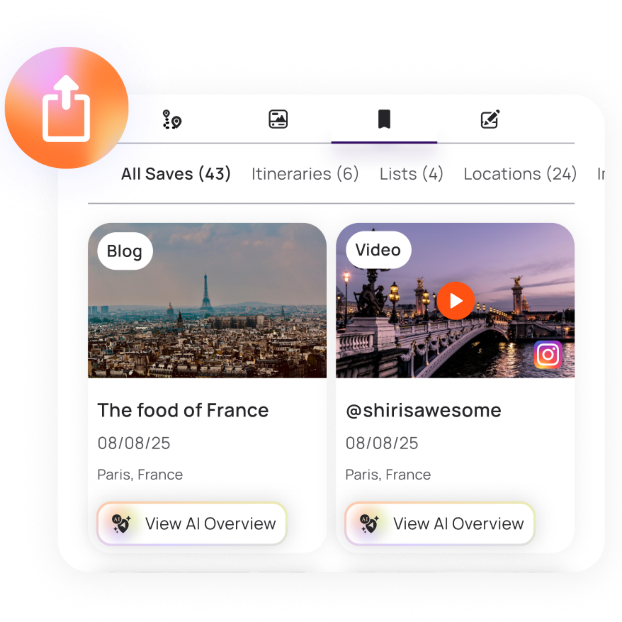 Tap a creator’s profile or import Reels, TikToks and other inspo to start planning your trip. Or, start with a blank slate (your choice).